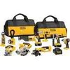 The DeWalt DCK692M3 18 Volt Kit contains the following: XRP Hammer Drill. Impact Driver. Circular Saw. Grinder. Jigsaw. LED Pivot Light. 2 x Tough System Kit Boxes. The machines in this kit feature the DeWalt XR 4.0Ah Li-Ion battery technology. Standard Equipment: DCD985 XRP Hammer Drill. DCF885 Impact Driver. DCS391 Circular Saw. DCG412 Grinder. DCS331 Jigsaw. DCL040 LED Pivot Light . 3 x 4.0Ah Slide Pack Batteries. Multi-voltage charger. 2 x DS300 Tough System Kit Boxes.